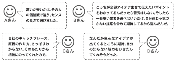 こんにちわ!ビークリエイティブの畠山さゆりです。先日、仙台でキキダスマーケティングの中山マコトさんのビジネスセミナーの司会を させていただきました。中山さんは「自分の頭でひねりださないコト」「困ったら他の人から聞き出すコト」と説かれました。ナルホド!自分 のことは意外と自分じゃわからないものですよね。そこで数社のクライアントさんに、どうしてBCACに仕事を発注したか尋ねてみました。