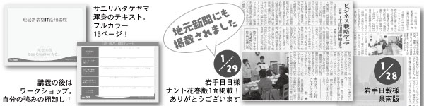 当日は弊社クライアント様中心に18社19名様のご参加を賜りました。起業10年を記念して行った地域還元イベント。「岩手の皆さんにもっと情報発信してほしい!」そんな気持ちでいっぱいです! 今回のテーマは「伝え方」のノウハウも大事ですが「マーケティング思考」の大切さがどちらかといえばメインテーマ。「誰」に「何」を「どのように」伝えるか決めないと的外れな情報発信に。そのあたりの大事な部分を一緒に考えてみませんか!?全てのノウハウ開示いたしま〜す!